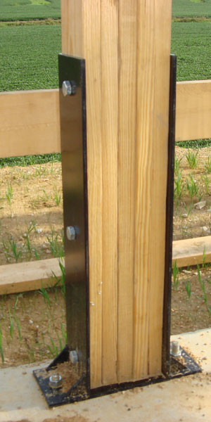 American Eagle uses a treated laminated ground column for buildings that are securely embedded in the earth. An 18" augured hole is drilled 48" deep, cleaned, tamped and a minimum of 60lbs of dry mix concrete is placed in the hole. A 9" steel rod is placed at the bottom of the ground column prior to is embeddment. More drymix concrete is placed around the column and the column is then backfilled and tamped with the spoils from the auger's overdigs. If your building requires your column to be placed on concrete, American Eagle employs a steel bracket that allows the wall column to be bolted to the concrete wall bracket.